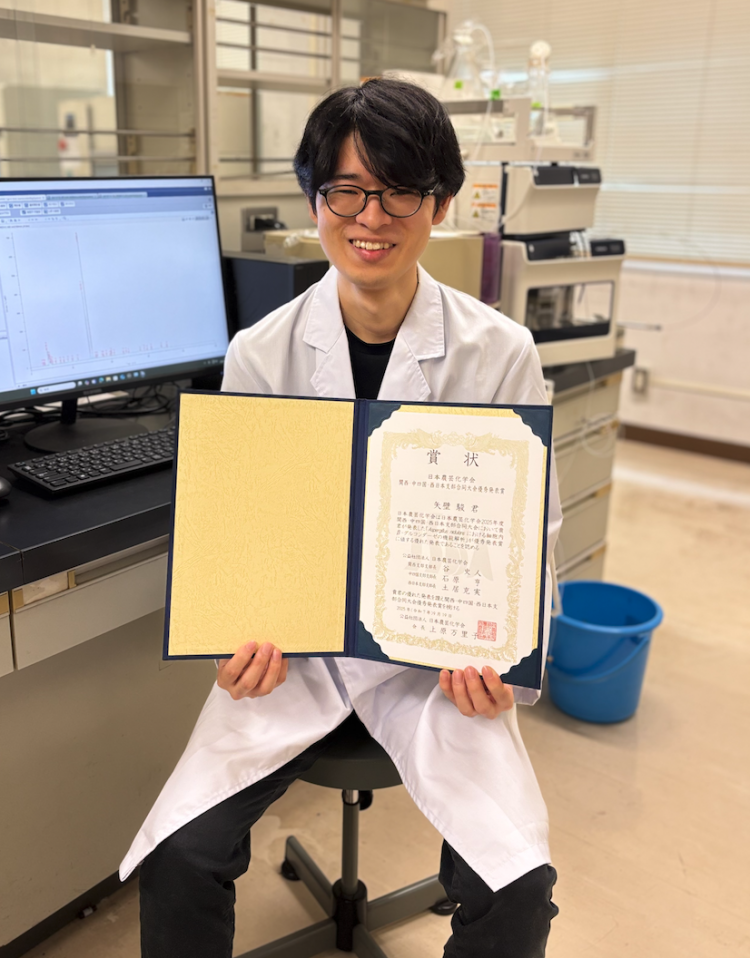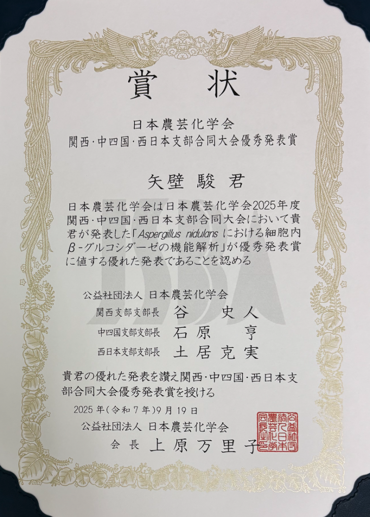 2025年9月18日(木)~19日(金)、岡山大学津島キャンパスにて行われた日本農芸化学会 関西・中四国・西日本支部 合同大会で、矢壁さん(大学院工学研究科応用微生物工学専攻修士課程1年・熊本県 熊本農業高校出身)が、「Aspergillus nidulansにおける細胞内β-グルコシダーゼの機能解析」を発表し、「優秀発表賞」を受賞しました。