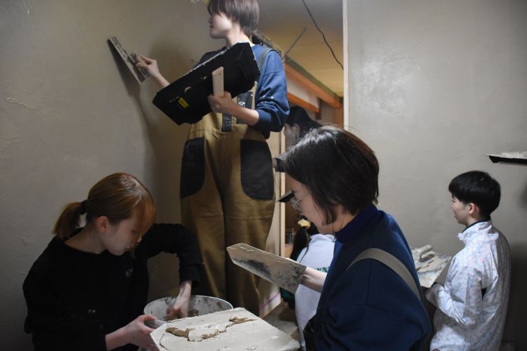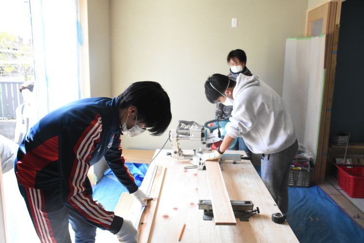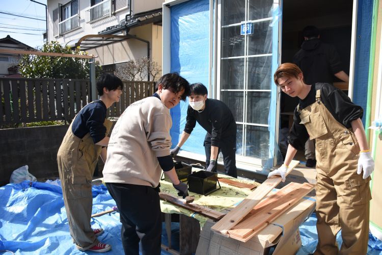 2025年3月11日(月)~14日(木)にかけて、本学 工学部建築学科 古賀研究室と九州産業大学・大庭知子准教授の研究室が、実践を通じた技術習得を目的に共同で住宅リノベーションプロジェクトに取り組みました。両研究室の学生は、職人の方々から工具の扱い方を教わりながら、自ら木材の切断や塗装を行いました。また、本プロジェクトを通じて、両研究室の学生同士が積極的に交流を深める機会ともなりました。