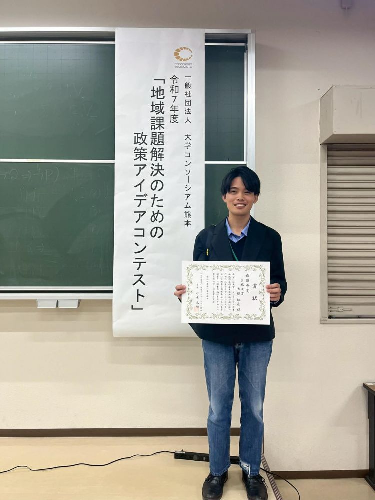 2025年11月15日(土)、熊本大学で「第5回地域課題解決のための政策アイデアコンテスト」の二次審査にあたる政策アイデア発表会が開催され(一次審査22件、二次審査10件)、古賀研究室の大塚さん(工学部建築システム開発工学専攻修士課程2年・熊本県 マリスト高校出身)が最優秀賞を受賞しました。大塚さんは、2023年度大会にも参加しており、2度目の最優秀賞の受賞となりました。