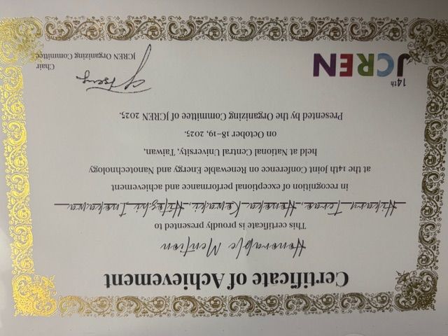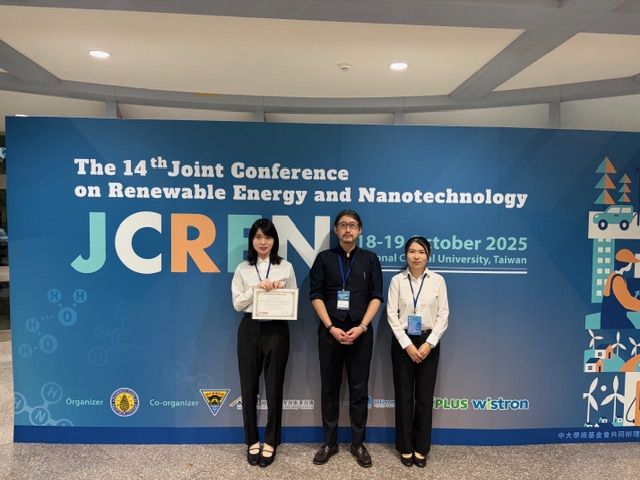 2025年10月18日(土)、台湾の国立中央大学で開催された国際会議The 14th Joint Conference on Renewable Energy and Nanotechnology(JCREN2025)にて、井野川研究室に所属する福永さん(大学院工学研究科応用化学専攻修士課程2年・鹿児島県 鹿児島育英館高校出身)と寺尾さん(同専攻修士課程1年・熊本県 真和高校出身)の2名がポスター発表を行いました。