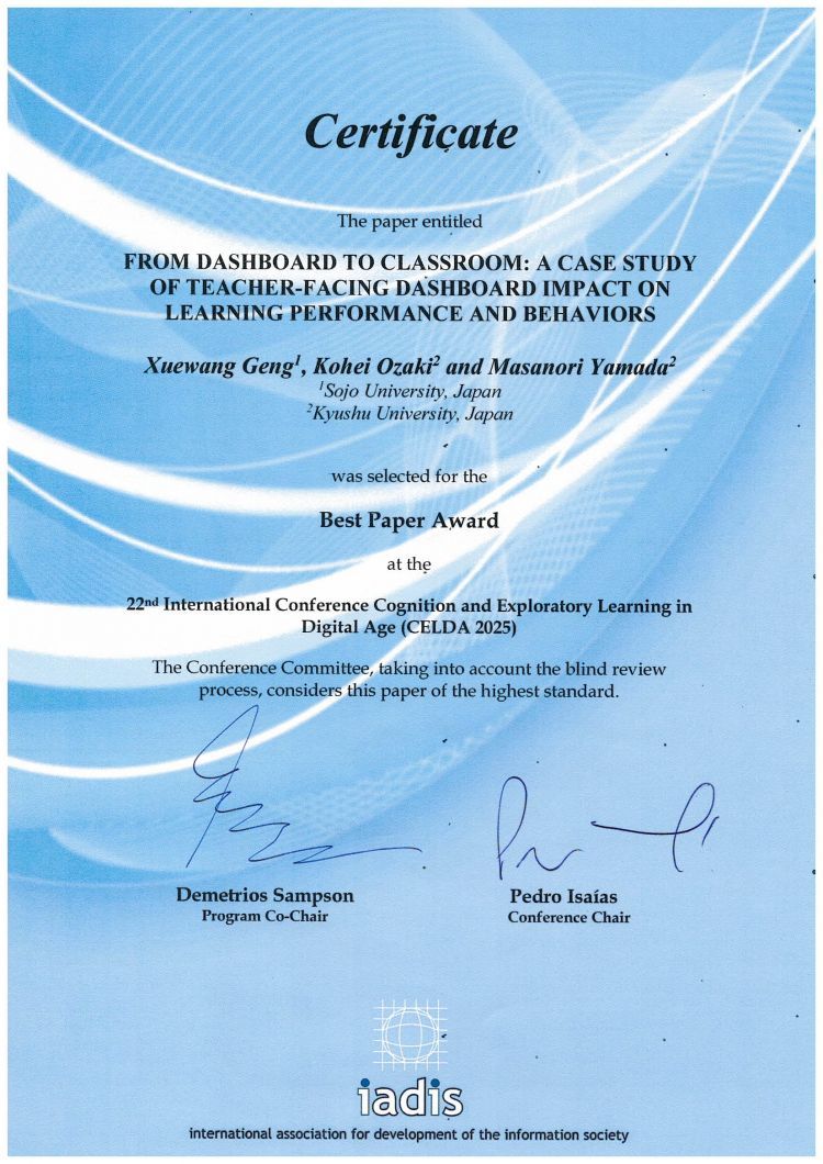 2025年11月1-3日、ポルトガル・ポルト市にて開催された第22回国際会議CELDA 2025(22nd International Conference on Cognition and Exploratory Learning in Digital Age)において、耿学旺准教授(情報学部情報学科)が、「From Dashboard to Classroom: A Case Study of Teacher-Facing Dashboard Impact on Learning Performance and Behaviors」を発表し、「Best Paper Award(最優秀論文賞)」を受賞しました。