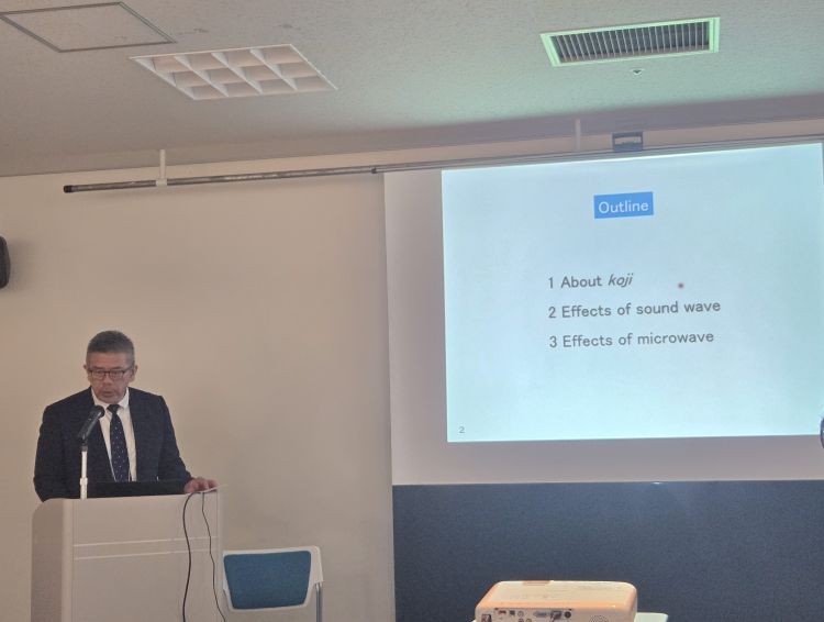 本学からは、主催者挨拶にて小野学長が、セッション1講演2とパネルセッションにて 三枝敬明教授(生物生命学部生物生命学科)登壇しました。講演2ではマイクロ波と音波による麹菌へのストレス応答反応に関する研究結果と発酵食品への応用について発表を行い、パネルセッションでは、他のパネリストとともに、本学とブルゴーニュ大学ヨーロッパとのこれまでの交流について、当時の写真を振り返りながらトークを行いました。