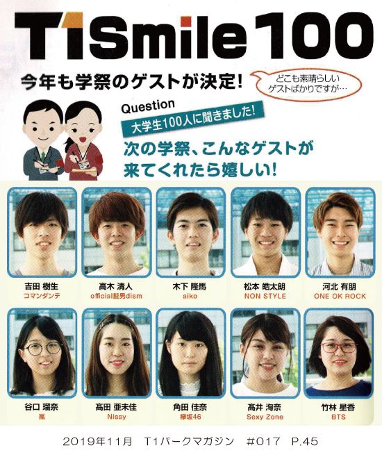 その他にも「T1 NEWS」「T1Smile100」「看板男子」「看板娘」「T1 Club&Circle Introduction」など多くのコーナーに本学学生が掲載されています。