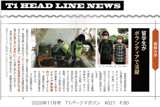「T1パークマガジン #021」(2020年11月発行)に、本学学生の活躍する姿が多数掲載されました。「T1 HEAD LINE NEWS」では留学生の豪雨災害ボランティア活動について、「学園祭実行委員 VOICE2020」では、井芹祭実行委員からのメッセージが取り上げられています。