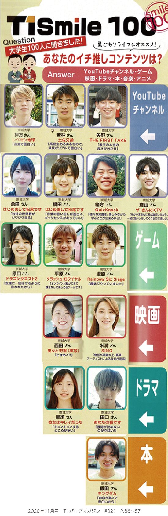 その他にも「T1 Smile 100」「Kumamoto Bikers Shop」「スマチャリ宣言!」「Kumamoto Fashionable Students」「T1美少女Navi」「T1イケメンNavi」などのコーナーに本学学生が多数掲載されています。