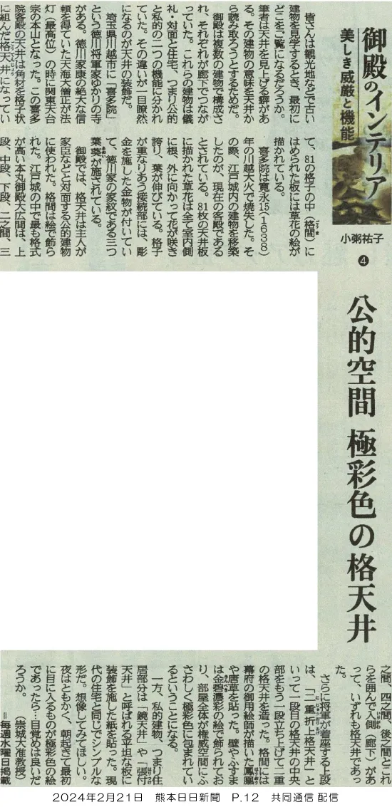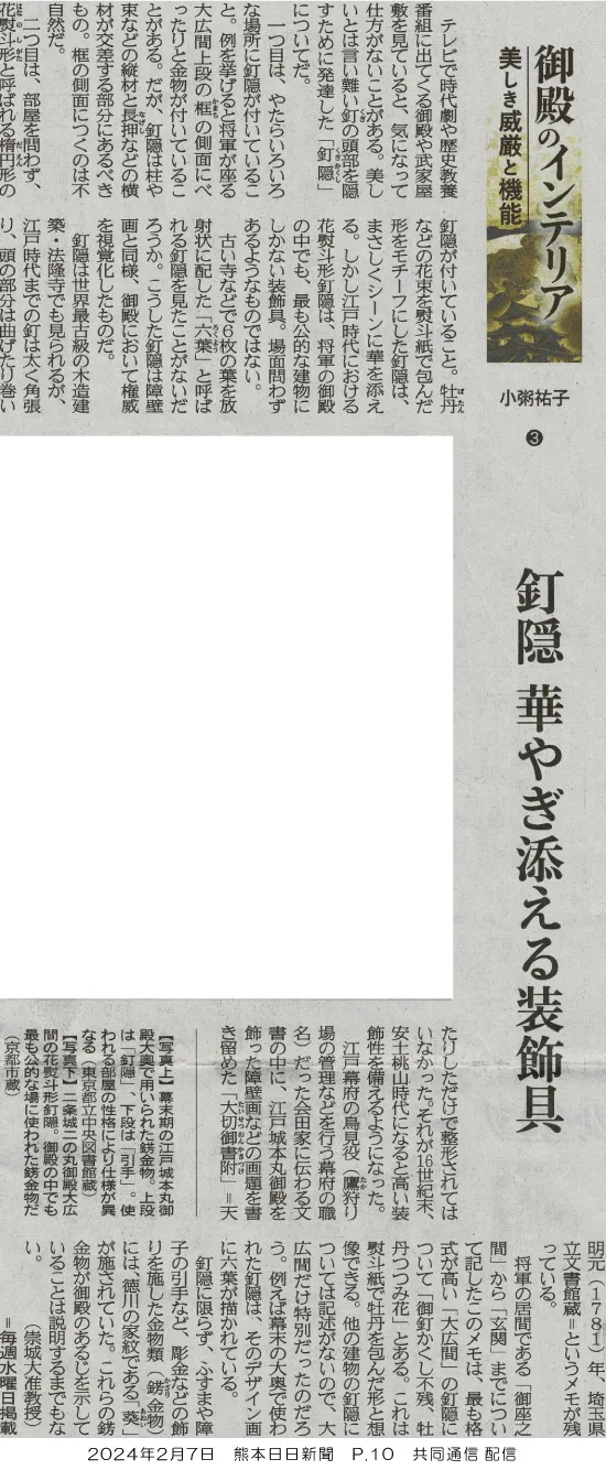 本学、小粥祐子准教授(工学部建築学科)の連載が共同通信社より配信され、熊本日日新聞、山陽新聞に掲載されています。連載は全8回の予定で、江戸時代の御殿の室内装飾から、当時の権力者のメッセージや暮らしぶりなどを読み解きます。
