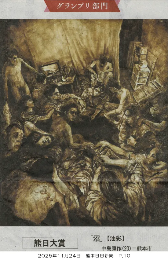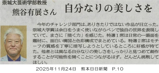 本学 中島さん(芸術学部美術学科洋画コース2年・熊本県 必由館高校出身)が、「くまもと『描く力』2025」のグランプリ部門で最高賞の熊日大賞を受賞し、熊本日日新聞(11月24日付)に掲載されました。また、チャレンジ部門で審査員を務めた熊谷有展教授(同学科)のコメントも掲載されています。