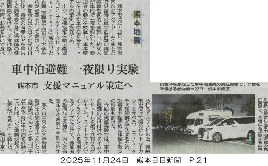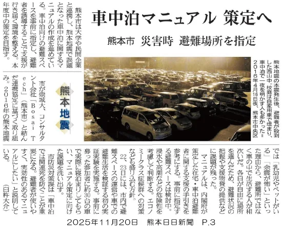 また、2025年11月22日(土)、11月23日(日)には、避難スペースの運営や車での避難生活を検証する初の実証実験を実施し、熊本日日新聞(11月24日付)に掲載されています。
